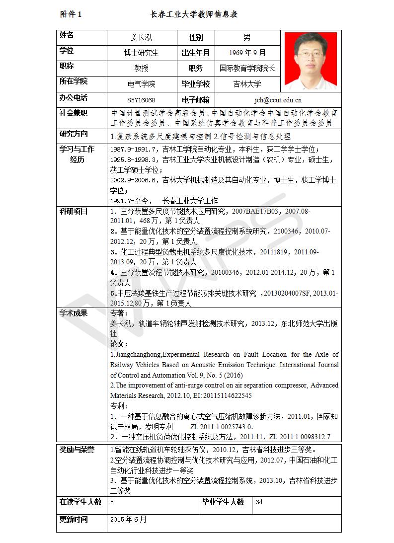 姜长泓教授,博士,现为乐天使学科带头人,国际教育公司经理;长期工作在教学、科研一线,1996年任讲师,2001年任副教授,2004年破格晋升教授;吉林省第八届青年科技奖获得者、国家科技支撑计划课题负责人、吉林省第四批拔尖创新人才(第三层次)、长春市第五批有突出贡献专家、长春市第二届“百名优秀科技工作者”。目前担任中国自动化学会中国自动化学会教育工作委员会委员、中国系统仿真学会教育与科普工作委员会委员、中国计量测试学会高级会员。