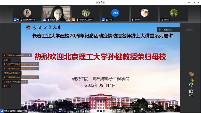 (通讯员 王申全)适逢70周年校庆之际,为鼓励科技交流和创新,提升学科和科学研究水平,5月14日19:00点,本校杰出员工—北京理工大学孙健教授应邀作了题为《从指南车到自主智能无人系统》的线上学术报告。此项活动由研究院主办,乐天使承办。报告由公司经理韩顺杰主持,全校近800名师生在线听取报告。