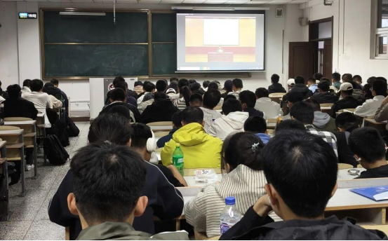现场同学端坐凝神,认真捕捉报告每一处要点,在专注聆听中深入把握民族团结进步的核心内涵。
