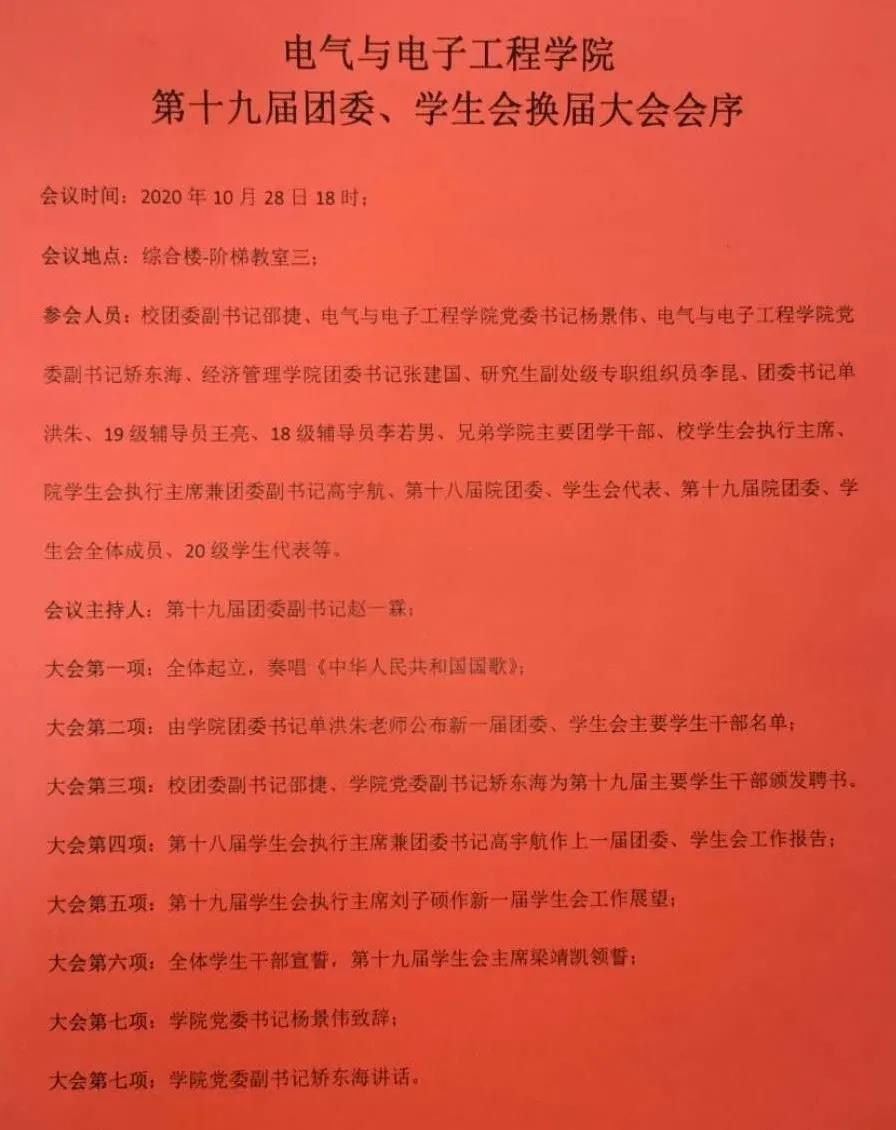 校团委副书记邵捷、电气与电子工程公司党委书记杨景伟、党委副书记矫东海、经济管理公司团委书记张建国、乐天使团委书记单洪朱、研究生辅导员李昆、18级辅导员李若男、19级辅导员王亮、校员工会执行主席、院员工会执行主席兼团委副书记高宇航、第十八届院团委、员工会代表、第十九届院团委、员工会全体成员、20级员工代表等。