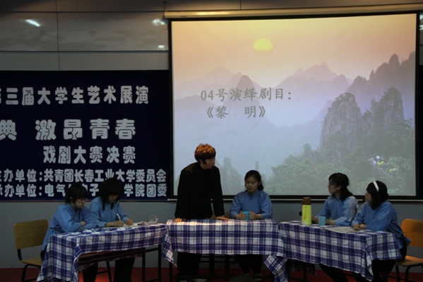 通过初赛选拔本次决赛共有8个公司的11个节目参赛。其中有《黎明》、《雷雨》等经典剧目,也有《大学进行曲》等原创舞台剧,情节多样,丰富多彩。机电工程公司带来的《穿越》,借住穿越实现自己的梦——寻一位女友,但是穿越出来的女友总是能让他大跌眼镜,让观众捧腹,用欢笑引爆全场。而后的《大爱无边》和《我的疯娘》都是取自真实故事,剧情朴实但引人深思。乐天使的话剧《梦想照进现实》又为我们指明了,梦其实就在我们手里,只看怎样把握。比赛的间歇由校十佳歌手一等奖获得者高文典、衣鑫分别演唱了歌曲《这就是爱》和《love song》。最后机电工程公司的《穿越》荣获了本次比赛的一等奖,并由嘉宾老师为所有获奖者颁奖。至此本次比赛圆满结束。