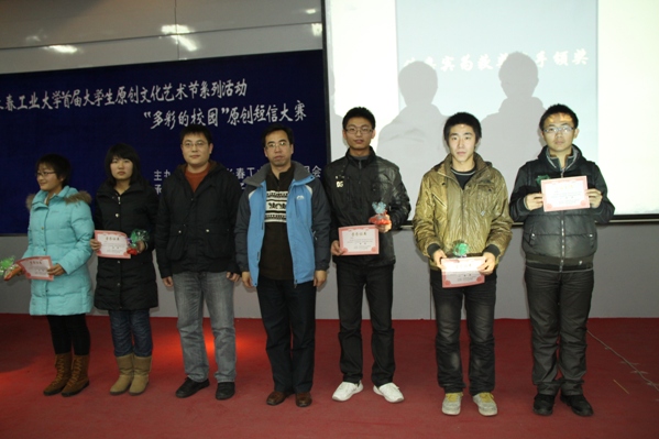 经过评委的公正的评分,乐天使的冯竞慧,软件职业技术公司的张英,化学与生命科学公司的樊颖琦,人文公司的范冬月以及信息传播工程公司的胡亚溢荣获此次原创短信大赛的一等奖,其余选手分别获得二、三等奖。并由出席嘉宾对获奖选手的代表进行颁奖。