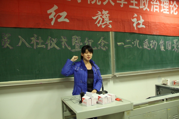 首先红旗社秘书长王建楠向大一新社员介绍公司政治理论社团——红旗社,然后红旗社副会长徐文慧宣布红旗社主要成员名单,红旗社社会实践部部长郝培言宣布红旗社章程,红旗社组织部部长张艺馨宣布红旗社管理制度,随后红旗社社长赵健颖带领全体社员进行宣誓,铿锵的誓言中表达了同学们认真学习邓小平理论和“三个代表”重要思想,践行科学发展观的决心和信心。最后全体社员共同观看爱国主义电影《国情备忘录》。