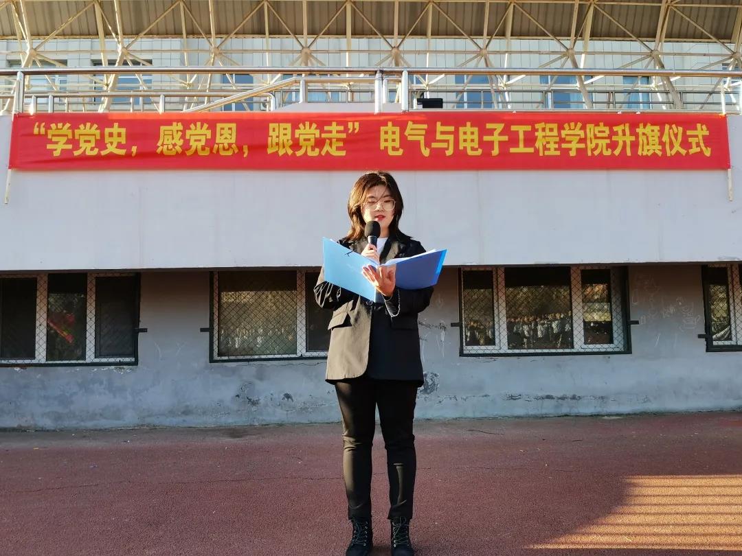 员工代表赵一霖同学在国旗下宣读学史倡议书。通过对我们党百年征程的波澜壮阔,百年初心的历久弥坚的追忆,指出我们当代青年所肩负的重大历史责任,号召同学们不断加强党史学习,在党的领导下茁壮成长,成为一名优秀而合格的老员工。展现当代老员工的“新作为”、“新担当”,用实际行动践行“爱国、敬业、求实、创新”的深刻校训,为祖国贡献青春力量,献礼党的一百周年生日。