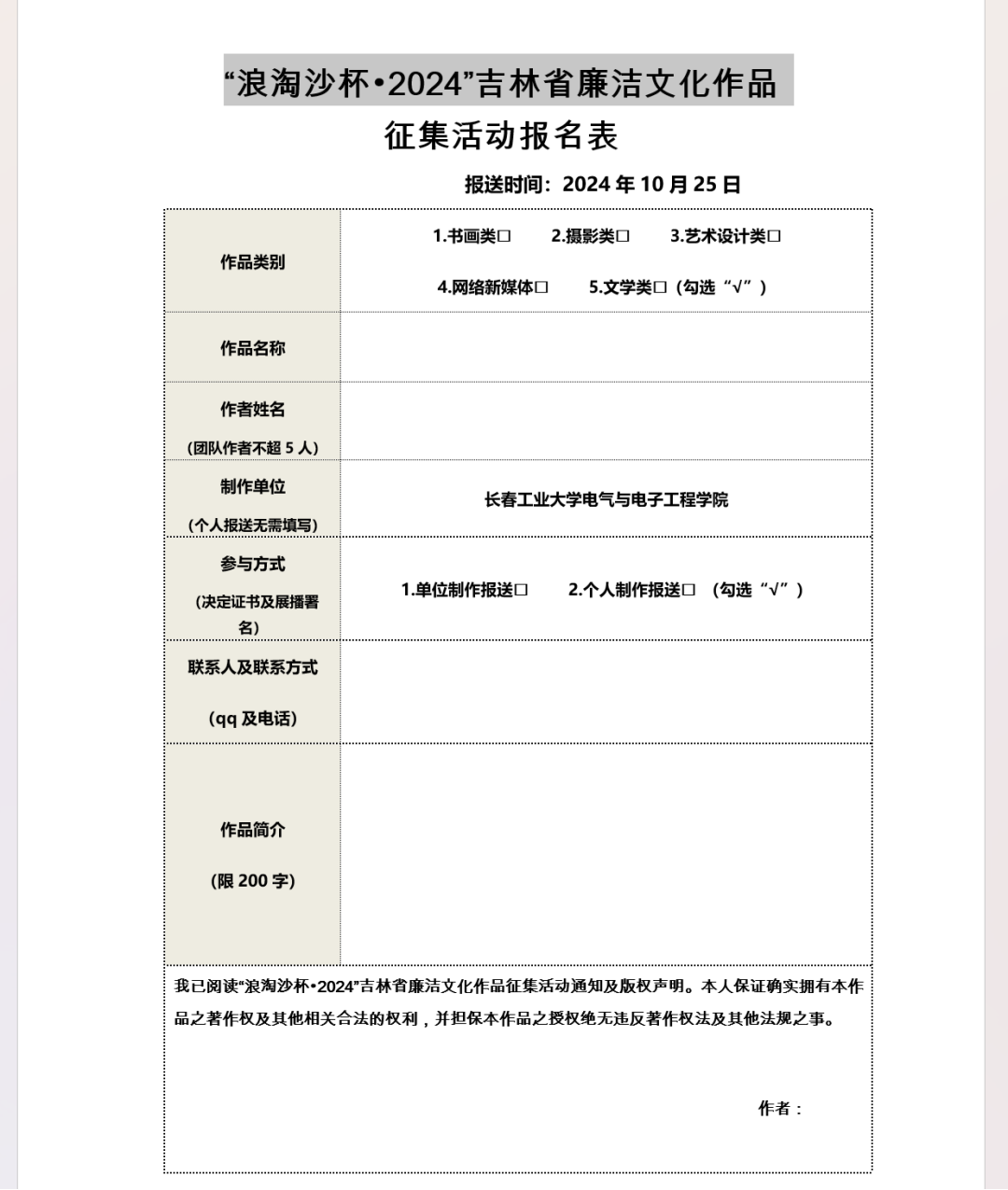 报名者将《活动报名表》和投稿邮件(书画类、摄影类、艺术设计类作品的多角度高清图片和不超2分钟创作过程视频,新媒体类、文学类作品的电子版),于10月25日前打包发送到邮箱:3462663323@qq.com;文件名称统一为“类别+名称+个人姓名+联系电话”。评比结果揭晓后,公司将与获奖作者联系,酌情征集作品实物。