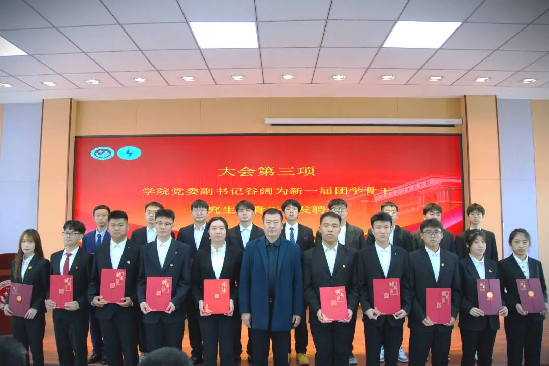 大会第三项:公司党委副书记谷阔老师为新一届团学骨干、研究生会骨干颁发聘书