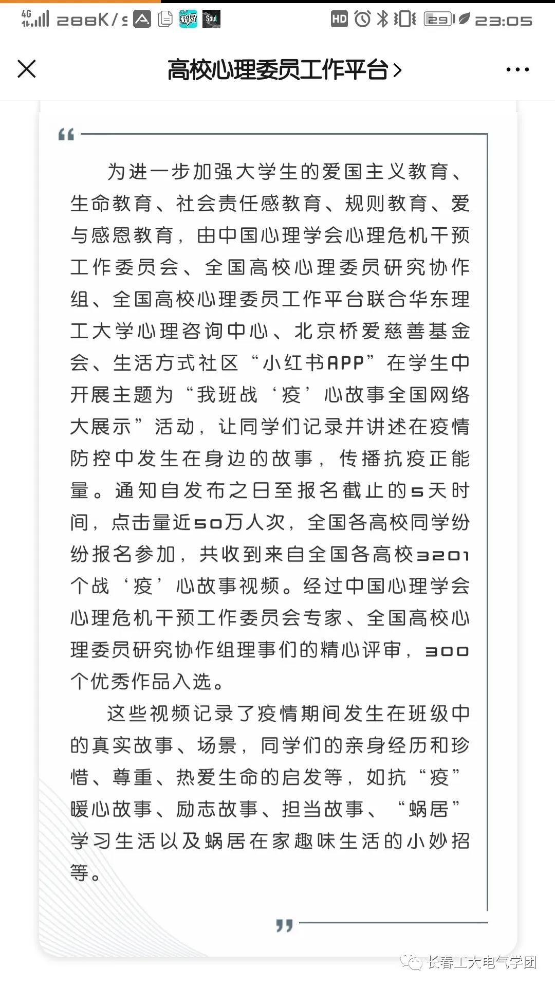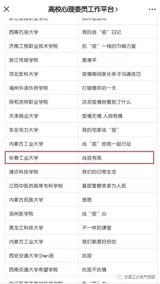 疫情当前,为进一步加强老员工的爱国主义教育、生命教育、社会责任感教育、规则教育、爱与感恩教育,引导广大青年员工弘扬主旋律,传播正能量,由中国心理学会心理危机干预工作委员会、全国高校心理委员研究协作组、全国高校心理委员工作平台主办、华东理工大学心理咨询中心、北京桥爱基金会协办的全国“我班战‘疫’心故事大展示”活动已完美结束。该活动全国点击量近50万人次,各高校同学纷纷报名参加,共收到3201个战“疫”心故事视频。