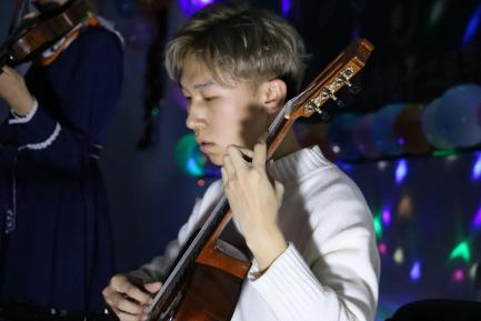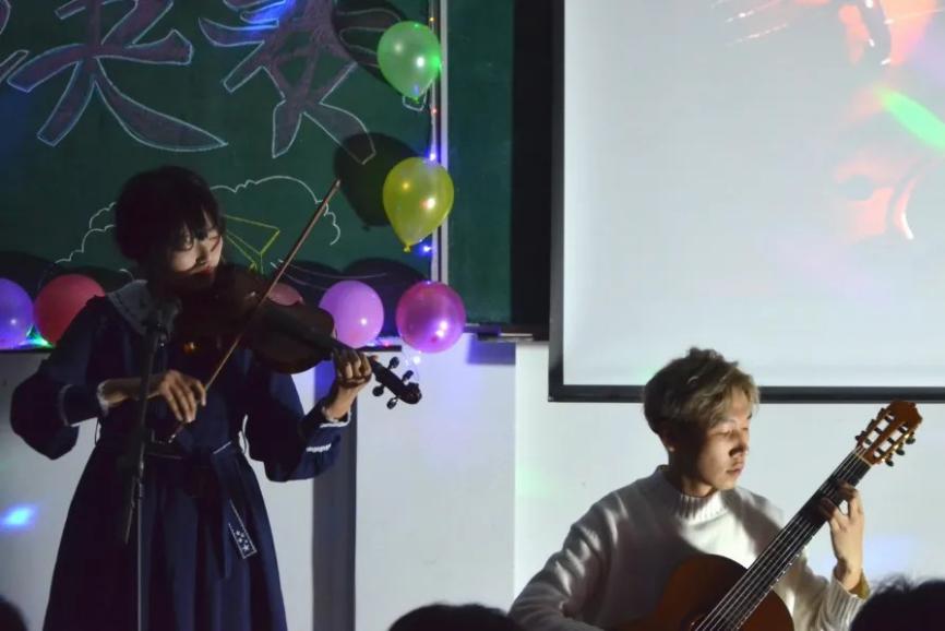 第一轮结束,各位选手暂时“鸣金收兵”,等待着各位评审对自己出色表现的回味。与此同时,中场加油活动没有缺席。由张宏扬、刘温馨带来的古典吉他小提琴合奏《卡农》让同学们有了一段缓冲时间,正如在品尝晚宴的主菜前的一壶甘甜的龙井,开胃生津,去品尝接下来的“音乐大餐”!