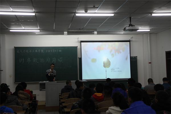 (通讯员 刘冬)11月3日公司在北湖校区开展时事政治月月谈理论学习系列活动之十月风云。本次活动由140301班团支部承办。公司辅导员助理王子峰老师和2014级全体员工干部参加了本次活动。