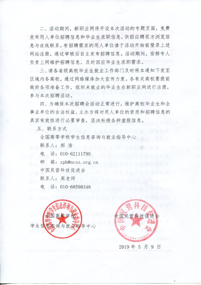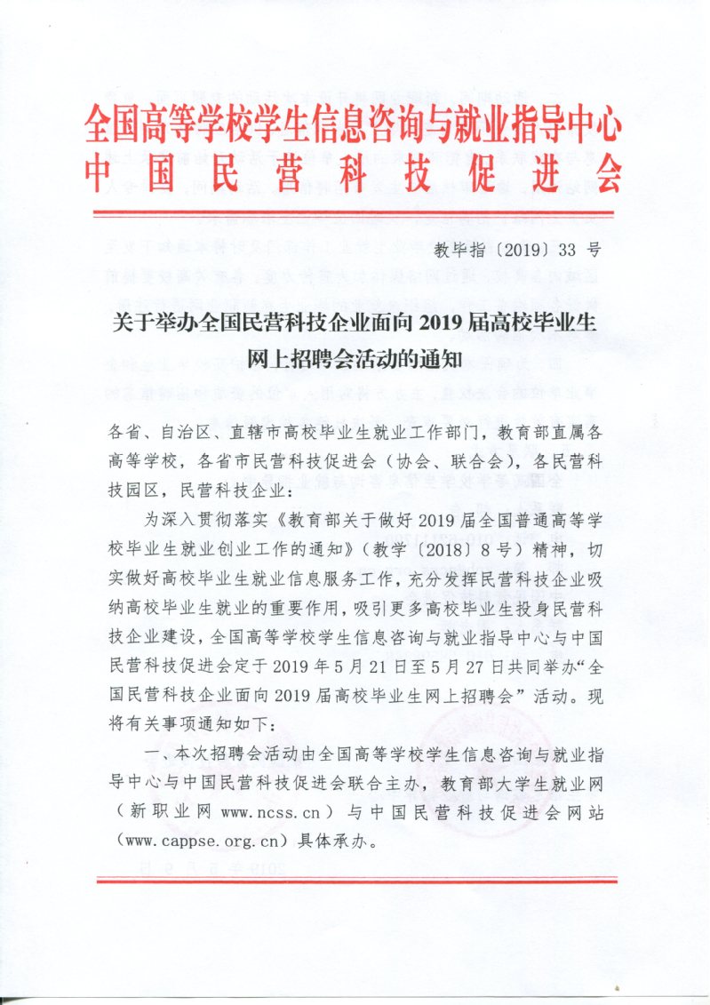 关于举办全国民营科技企业面向2019届高校毕业生网上招聘会活动的通知