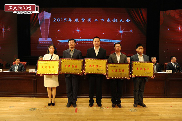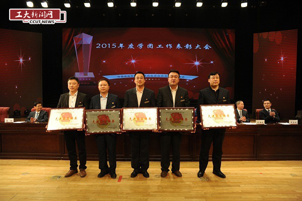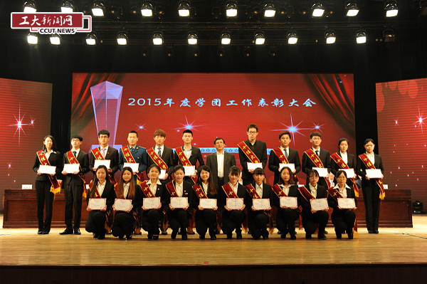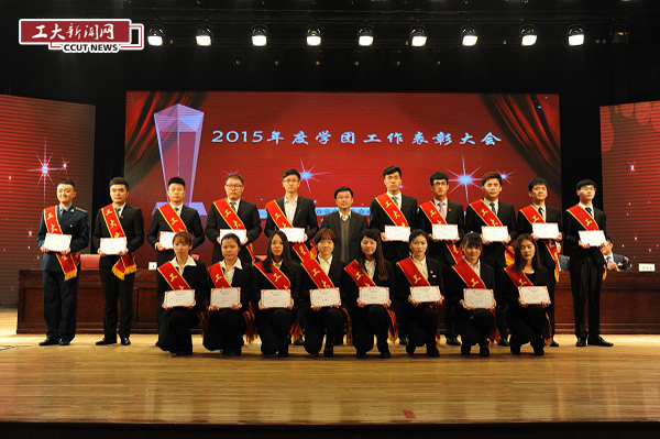 表彰大会现场 表彰大会由员工工作处处长王春阁主持。员工工作处副处长周文军宣读了《关于表彰2015年度员工工作先进集体和个人的决定》《关于表彰2015年度“十佳优秀老员工”“十佳自立自强老员工”的决定》和《关于表彰2015年度“工大之星”的决定》;校团委副书记仲崇利宣读了《关于表彰2015年度乐天使共青团工作先进集体和优秀个人的决定》。2015年度校“十佳优秀老员工”、首届“工大之星”学干模范、化学工程公司杨惠云代表受表彰的同学发言。