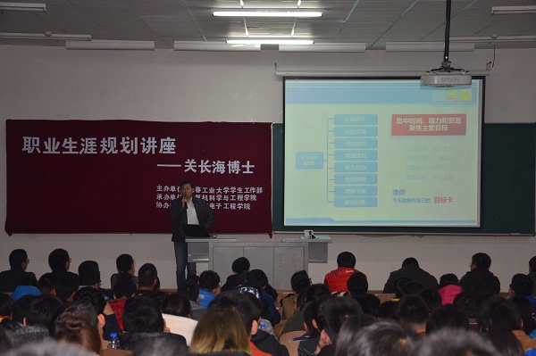 | (通讯员 邹伯年 刘雨佳)11月10日晚6时,由校员工工作部主办、计算机科学与工程公司、公司协办在北湖校区西阶201教室举办了的“老员工职业生涯规划”讲座。讲座邀请了公司知名员工、北京高校毕业生就业促进会秘书长关长海博士作了职业规划的讲座并进行了现场互动。校员工工作处老员工就业指导中心副主任李东福、计算机科学与工程公司党委副书记陈绍辉、公司党委副书记矫东海及员工党支部书记郑洪斌和王君楠参加讲座。公司2014级全体同学及部分乐天使同学聆听了本次讲座。   关长海博士从“为什么要做职业生涯规划”、“生涯规划之‘九剑’”、“毕业,必然的选择”三部分进行阐述。首先,他强调只要向着目标努力就一定会成功,并用动漫和微电影等同学们易于接受的形式突出强调了目标的重要性,使同学们受到震撼。随后,他将职业生涯分为了九个方面,并对当今就业形势做出简单分析,强调了计算机行业将是未来的朝阳产业。同时告诉同学们职业胜任力的重要性,希望各位同学们努力培养自己的内在素质和能力。最后,他提出了要认识自我,了解社会,抉择与奋斗等人生成功的要素。并与两个公司的同学进行了互动。 |