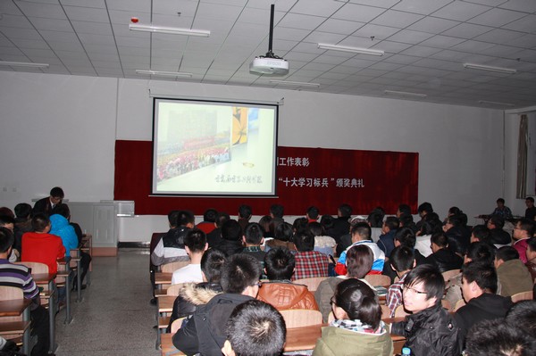 会上,还播放了“十大学习标兵”的短片。让同学们看到了榜样们学习、生活、工作中的情景。也让同学们了解到了全面发展的重要性,令大家受到鼓舞,以他们为榜样,让同学们更有斗志、更有方向的去面对学习和生活。