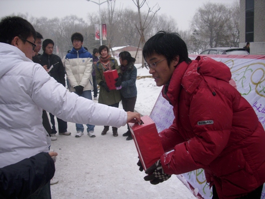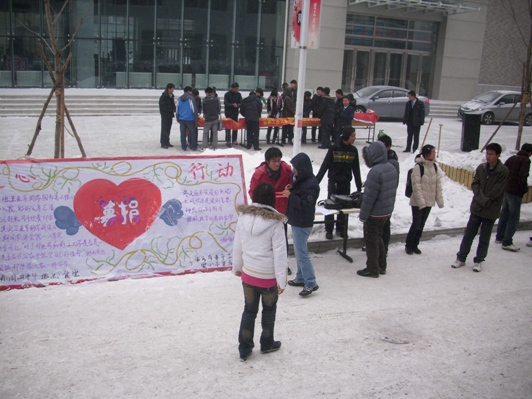 | 用爱心筑起一道爱的屏障 ——乐天使为患病同学卫亚军募捐 员工记者 程飞 刘英策 见习记者 常慧康 通讯员 杜亮 新闻回放:11月17号晚,正在教室自习的080312班同学卫亚军因先天性心脏病突发被班级同学送往吉大一院就诊,由于病情严重,班长杨奥棋把这一情况告诉了辅导员高博老师。高老师在得知此消息后及时通知了卫亚军同学远在山西的父亲,并在第一时间带着公司的爱心基金来到吉大一院看望卫亚军,在向医生询问了卫亚军的具体病情后,他恳请医生一定要尽最大努力治好卫亚军的病。 卫亚军同学来自山西运城的一个农民家庭,父母务农。卫亚军的母亲也患有心脏病,卫亚军和姐姐都在外地上大学,家庭经济情况十分拮据。然而这高昂的手术费用让这样一个原本就困难家庭如何承担得起呢?于是展开了爱的接力,开始铸造爱的城墙。 镜头一: 病中没有亲人的陪伴,也许孤独就如影随形了,在卫亚军的亲人没赶到的时候,080312班的同学每天自发地去医院看望他,陪他聊天,陪他说笑,照顾他,用爱包围着他,让他体会到这个大家庭的温暖。每天下午四点到七点是卫亚军最危险的时候,班级同学就坐在他旁边,寸步不离的守着他,给他讲一些班级、寝室的事,尽量转移他的注意力。直到他熬过了这段艰难的时间,同学们悬着的心才渐渐放下。 同学们还率先在班级内为他发起了爱心捐款,一颗颗真挚的心汇聚成爱的洪流。最少的100元,最多的500元,二十八个同学在几分钟内就捐出了5400多元,但是这些捐款根本不够支付高昂的手术费,解决不了卫亚军同学的实际问题。班级班委商议后建议向全院同学发起爱心捐款倡议,这一想法也得到了公司员工办公室老师的大力支持。 镜头二: 在第二天的员工干部早会上,公司办公室辅导员老师向各班员工干部介绍了卫亚军的情况,号召大家积极奉献爱心,帮助卫亚军渡过难关。乐天使大一至大四各班在得知卫亚军同学的病情后,积极组织了捐款,仅仅一天捐款数额便达到三万多元。有两位老师在上课时听说了卫亚军的病情后,委托员工干部将自己的捐款带给卫亚军同学,同时祝愿他能够早日康复。 镜头三: 11月26日中午,天空有些阴霾,寒风夹杂着雪花簌簌的落下,这一天是西方的感恩节。在南湖校区食堂门前一块宣传板上的“募捐”二字显得十分醒目,宣传板上写着乐天使爱心志愿者协会为卫亚军同学献爱心的倡议书。原本行色匆匆的行人渐渐慢下了脚步,驻足在宣传板前加入到为卫亚军同学的捐款活动中。不少参加募捐的同学向爱心协会的会员们打听着卫亚军的身体状况,并委托他们带去自己对卫亚军的祝福。风雪中,爱心协会的会员们怀抱着募捐箱分站在宣传板的两侧,面颊冻得通红。10元,20元,50元,甚至100元,两个募捐箱在师生们的爱心捐赠下愈然渐满。有的同学甚至将自己兜里所有的钱都捐赠出来。“虽然我并不认识他,但我知道他曾生活在我们的身边,我们只是想尽自己的绵薄之力去帮助他”一位刚刚捐完款的同学对记者说到。“这是我们为卫亚军同学的爱心捐款,”一位同学代表校心理协会将860元捐款放到募捐箱里。卫亚军曾是校心理协会的成员,在得知他的病情后,校心理协会也积极组织了为卫亚军同学的捐款活动。正在举办感恩节签名活动的校勤工助学委员会在听说卫亚军的情况后,也利用自己的音响设备帮助宣传募捐。“感恩的心,感谢有你”,在《感恩的心》的乐曲声中,食堂门前的工大学子爱心涌动,短短的一个多小时,“爱心行动”共募捐到现金3290多元。