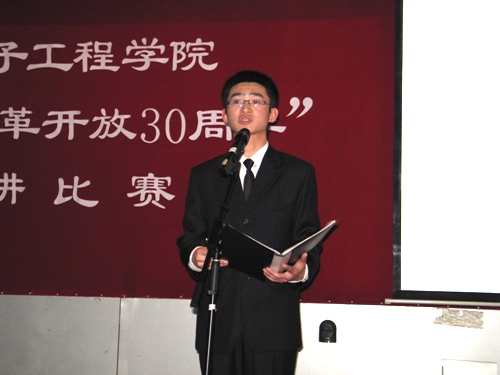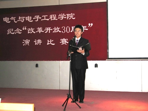 12月1日晚6:30,公司在南湖校区报告厅举办了主题为“为今天喝彩,为明天加油”——纪念“改革开放30周年”演讲比赛。应邀出席本次活动的嘉宾有公司员工办公室辅导员赵爽老师,校社团联合会主席张福厚,校广播站站长丛衡,校社团联合会秘书长徐志星,材料科学与工程公司员工会主席冯亚斌。 伴着一段题为“改革开放三十年精彩瞬间”影片的放映,拉开了此次比赛的帷幕。比赛共分为三个部分,分别为自我介绍,讲演阶段和诗歌朗诵。选手们的讲演慷慨激昂,他们讲诉了中国改革开放三十年来所取得的重大成就和中华儿女面对灾难,自强不息,众志成城的坚毅品质,激情的讲演振奋了在场的每一位观众。10位选手的诗歌朗诵《歌颂祖国》,让我们再一次感受到了中华民族的崛起和伟大复兴。最终来自080305班的刘思杰凭借出色的发挥获得一等奖,080308班的谭庆印和080307班的王谱铭分获二等奖。 此次活动是公司纪念改革开放三十周年重要活动之一,让同学们充分感受到了改革开放三十年来中国经历的沧桑巨变和光辉历程,让同学们真正意识到改革开放更是思想的改革,增强了同学们爱岗敬业、服务奉献社会的信心。