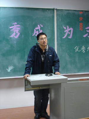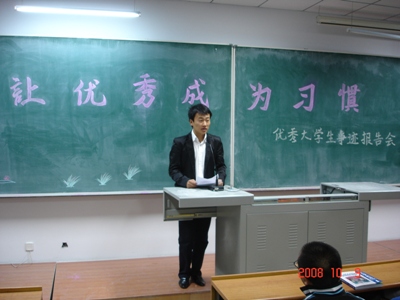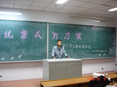 | 2008年10月9日晚6:30,公司在教学科研楼307教室举办学风建设系列活动之“让优秀成为习惯”优秀老员工事迹报告会。公司辅导员赵爽、高博参加了本次报告会。报告会由高博老师主持。 报告会中,050308班邢本东,050303班姜鸣燕,060304班张福厚,070307班陈志娟四名优秀老员工代表以自己的亲生经历从不同的角度告诉在座的新生同学们,只要保持一颗奋斗的雄心,孜孜不倦的付诸行动,优秀并不是梦想,优秀是一种习惯。院社团联合会主席邢本东同学首先上台发言,他重点介绍自己的竞赛经历,竞赛不仅丰富了专业知识,也让同学们在以后的就业竞争中站到一个新的高度。连续四次一等奖学金,国家助学金获得者姜鸣燕让大家明白天道酬勤的真理。张福厚是现任校社团联合会主席,他虽工作任务重,但能很好处理工作与学习的关系,是优秀员工干部的典范。最后一位上台的陈志娟同学,则以自己自立自强的求学之路深深感动和教育了每一位新生,会场一次又一次爆发出热烈的掌声。发言结束后,赵老师给这次报告会做了总结性发言,勉励大家以这四名同学为榜样,努力超越自己,让未来工大为自己而骄傲,报告会在热烈的气氛中圆满结束。 本次报告会是公司学风建设系列活动的重要组成部分,参会同学均受鼓舞和教育。会后,08级新生纷纷表示通过本次活动,更加明确了学习目标,坚定了奋斗信念,大家会以四位学长为榜样,让优秀成为习惯。