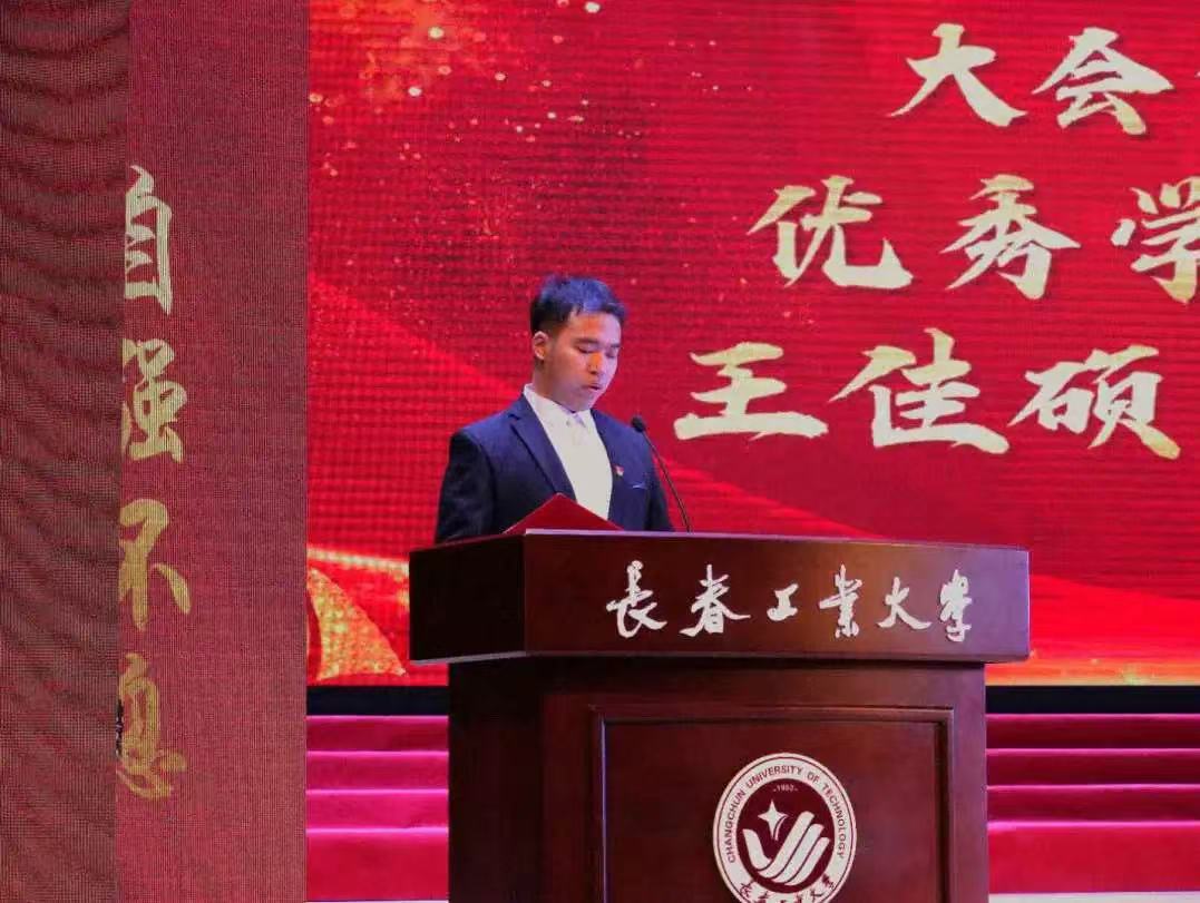 优秀员工代表,校员工会执行主席、校三好员工、国家奖学金获得者王佳硕同学上台发言